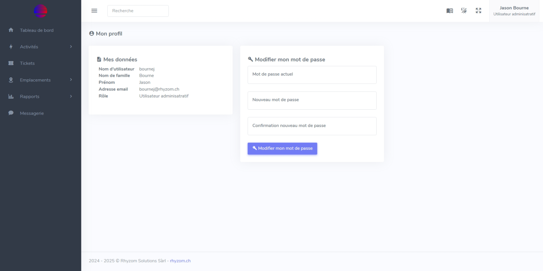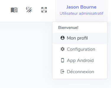 Pour accéder au profil utilisateur, veuillez cliquer sur l'espace utilisateur en haut à droite puis sur le menu Profil.