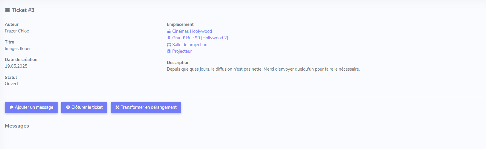 - Convertir un ticket ouvert en dérangement (cela clôture automatiquement le ticket)