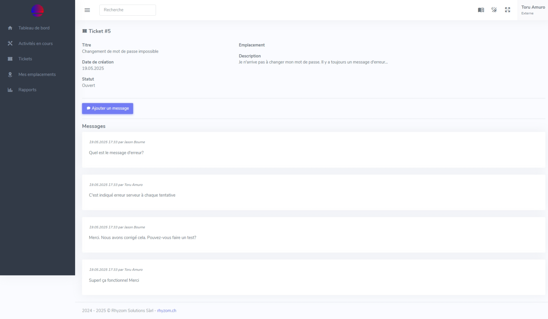🟦 vue d'un ticket ouvert pour un utilisateur externe