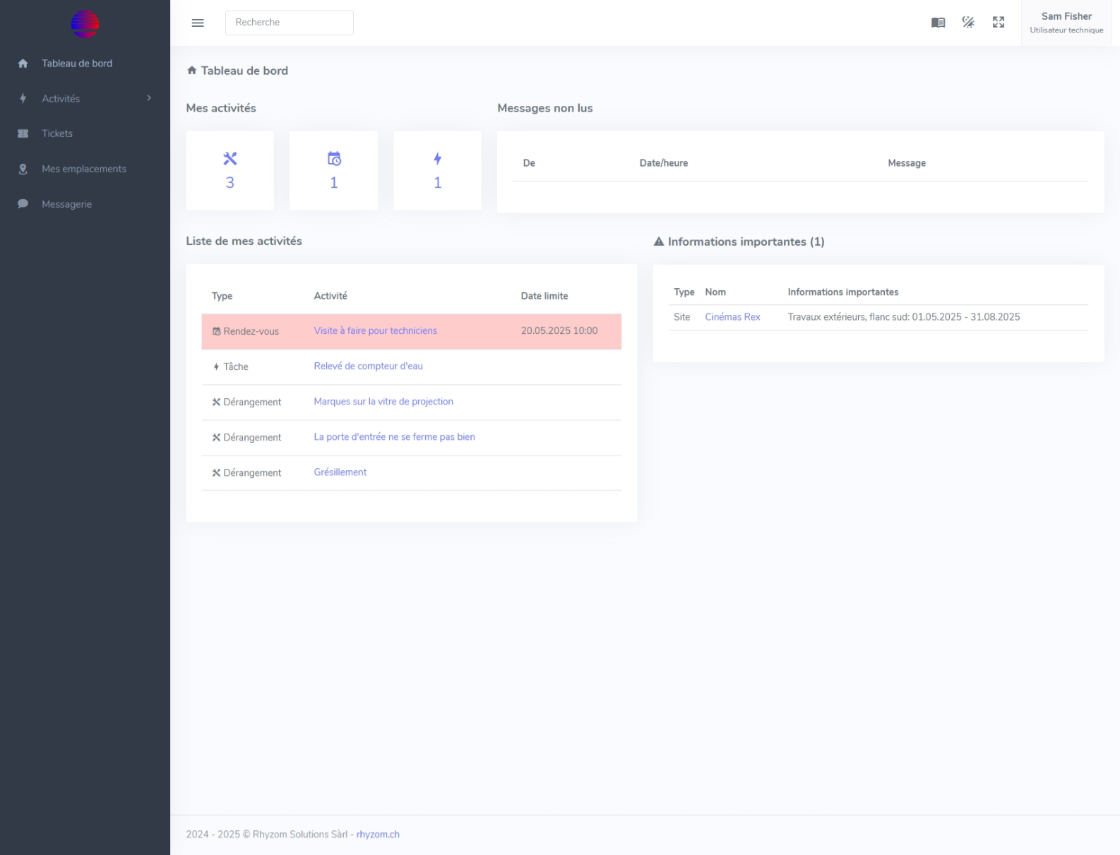 L’application de facility management a été conçue pour faciliter la gestion opérationnelle, technique et administrative de parcs immobiliers de toute taille. Elle centralise les informations essentielles des emplacements (sites, bâtiments, zones, installations), activités (tâches, rendez-vous, dérangements) et tickets tout en assurant un suivi fluide via une messagerie intégrée et un système de droits d’accès différenciés.